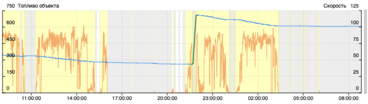 С проведенной тарировкой и корректной настройкой датчика уровня топлива в системе мониторинга (Wialon, ГЛОНАСССофт) график топлива должен иметь вид как на рисунке ниже, а заправки сходиться с высокой точностью. Бывают случаи, когда некоторые недобросовестные исполнители тарируют баки механическими счетчиками, либо с помощью канистр. Ни о какой точности в этом случае не может быть и речи.