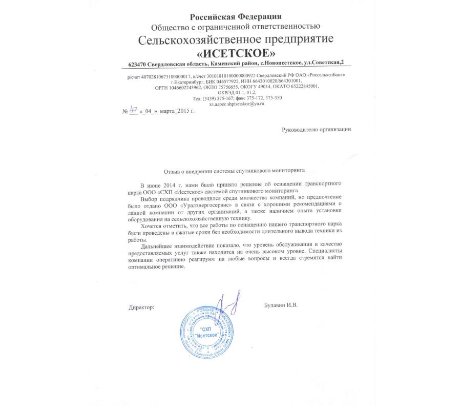 В июне 2014 г. нами было принято решение об оснащении транспортного парка ООО «СХП «Исетское» системой спутникового мониторинга.