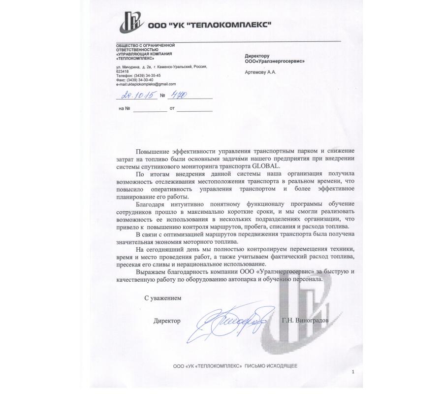 Руководство МУП «Горкомсети» выражает благодарность компании ООО «Уралэнергосервис» за плодотворное сотрудничество, качественное и своевременное выполнение работ по оснащению нашего транспортного парка системой спутникового мониторинга.