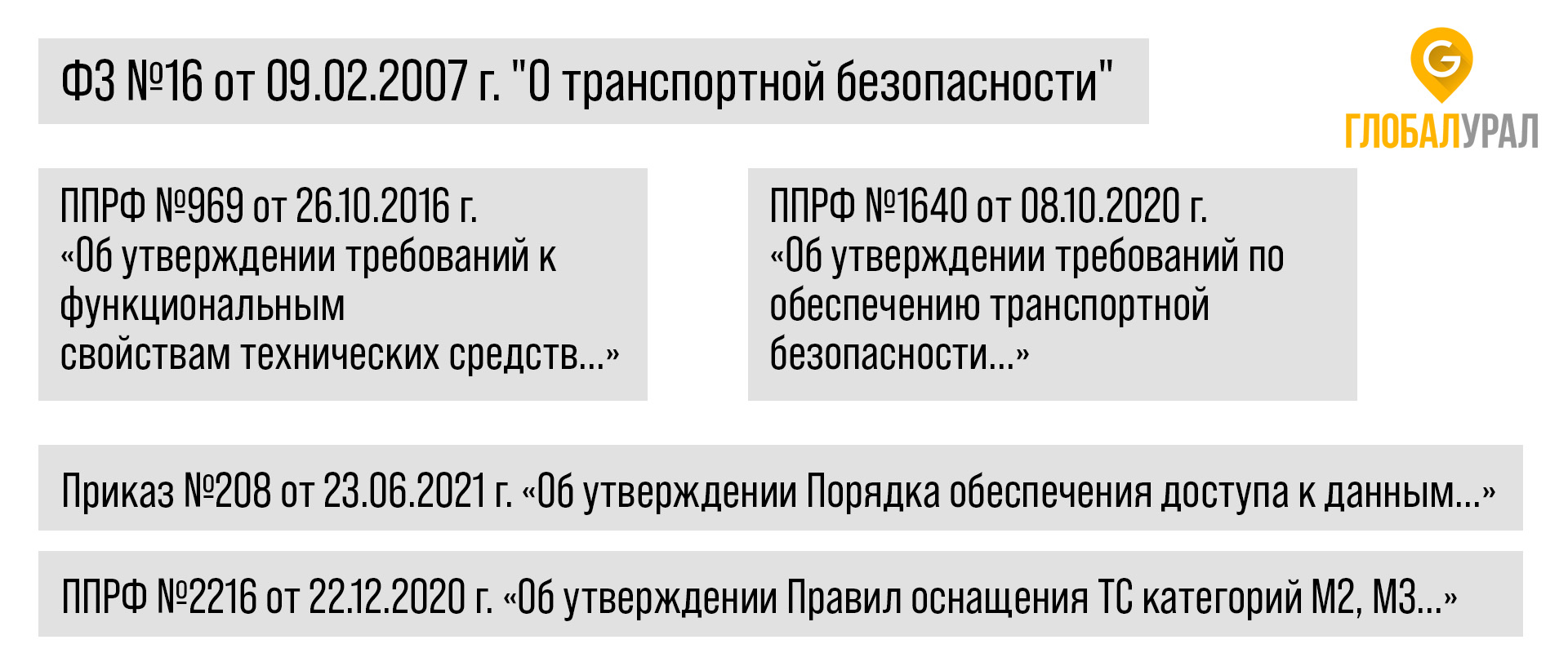 Позже, уточняя требования к оснащению транспорта, появились два Постановления Правительства РФ: ППРФ №969 от 26.10.2016 г. «Об утверждении требований к функциональным свойствам технических средств...» и ППРФ №1640 «Об утверждении требований по обеспечению транспортной безопасности...».