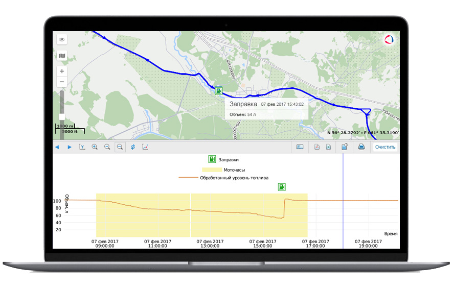 На топливном отчете в реальном времени показывается фактический уровень топлива в баках транспортных средств, а также в автоматическом режиме фиксируются заправки/сливы топлива с указанием времени, места и количества заправленного/слитого топлива.