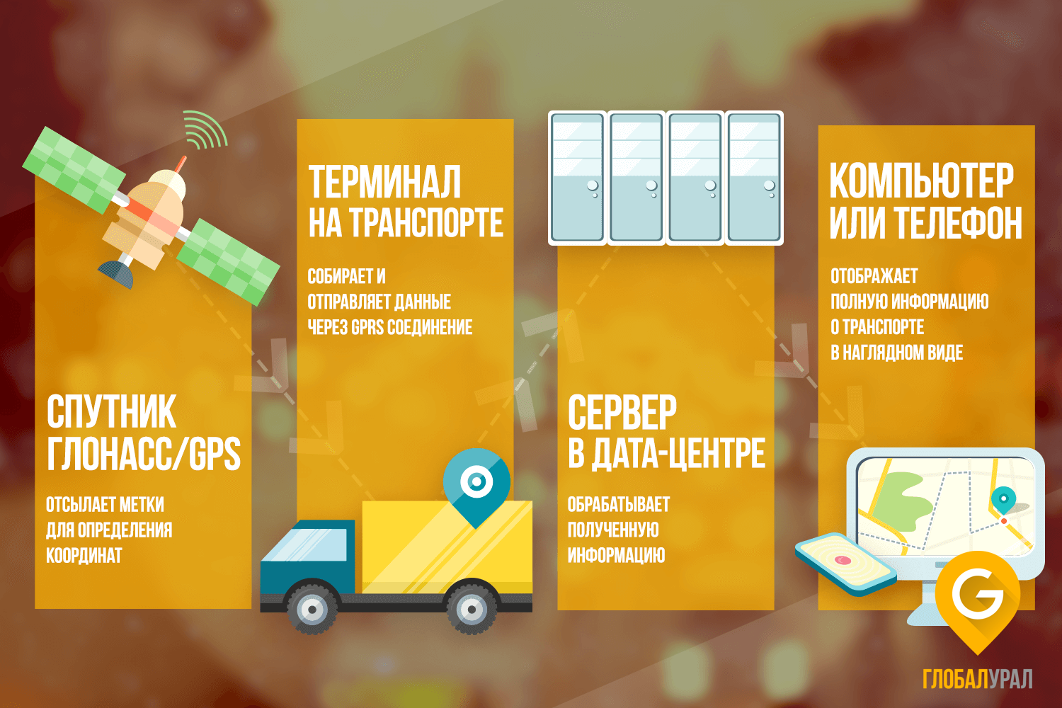 Спутниковый мониторинг ГЛОБАЛУРАЛ является программно-аппаратным комплексом, который позволяет осуществлять контроль, слежение и учет эффективности работы транспорта.
